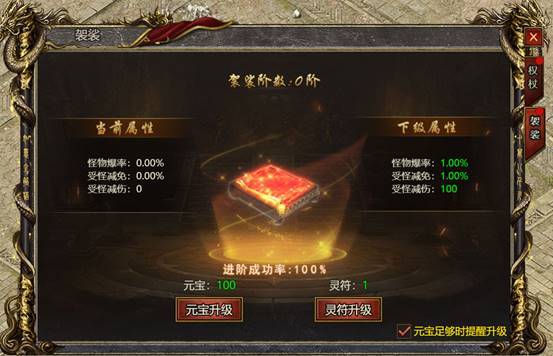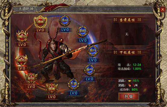 共有10个小系统组成,左侧为高级属性,右侧为初级属性,升级材料可通过打怪、击杀BOSS和回收高级装备获得。