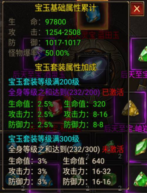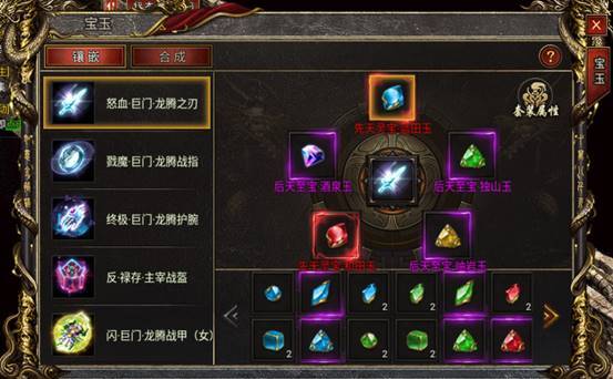 共有五种类型的宝石,可通过每日充值活动或限时玩法中获取,镶嵌宝石达到一定等级,还可获得套装加成。