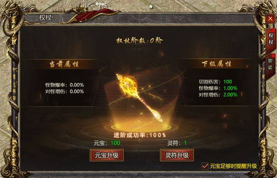 分别权杖和袈裟,权杖主打攻击属性,袈裟主打防御属性,前期优先升级,挂机打BOSS轻松无压力。