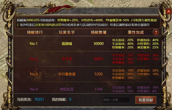 捐献灵符达标可获得保底属性加成+排行属性加成双重奖励,全服玩家捐献灵符会算入奖池,在攻沙结束后总奖池100%的灵符均分给所有参加活动的沙巴克成员!结束后加成属性、排行、奖池清空。